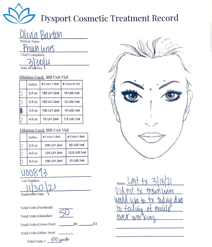 When I went in for my consultation, I was still unsure about which injectable to pick. This uncertainty led to the ultimate choice of Dysport; it is absorbed and broken down in the body more quickly than Botox, ideal for newbies like me who want less of a commitment as we get our feet wet with injectables.