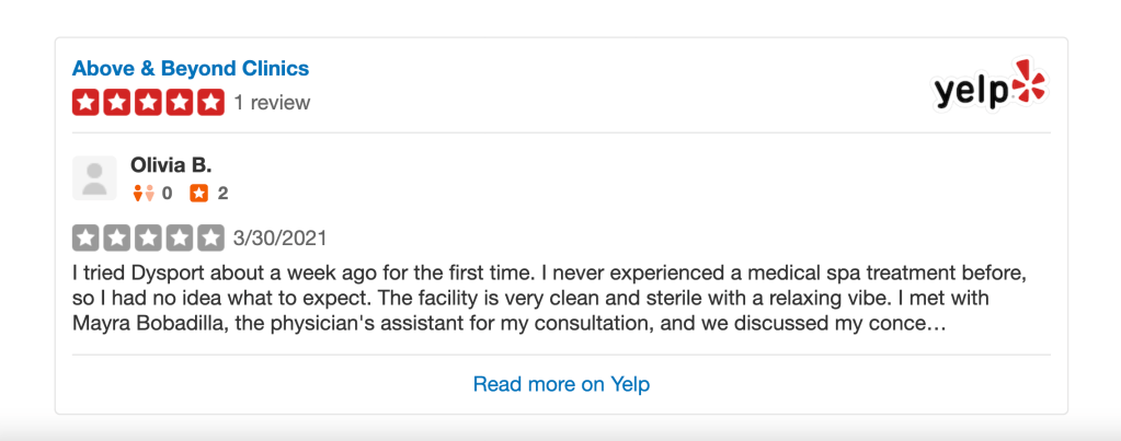 After seeing my Facebook post, one of my good friends opened up to me about her experience with injectables; she tried both Botox and Dysport, and recommended Dysport to explore quicker results with less commitment. She recommended a place in Roseville, where she, and her mother (unbeknownst to her dad / one of my commenters) have received several treatments with positive results — Above & Beyond Clinics.